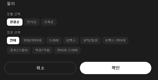 장르별 구분 탭에 들어가면 로맨스, 액션, 판타지 같은 종류별로 모아진 웹툰 목록을 살펴볼 수 있고 최신 작품과 완결 작품을 필터로 지정해 찾아보기도 편리합니다.