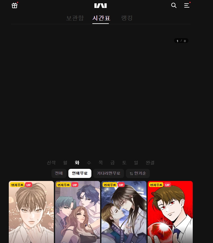 홈 화면에는 요일별 연재 작품이 나열돼 있어서 월요일부터 일요일까지 보고 싶은 회차를 손쉽게 선택할 수 있고 인기 작품 랭킹과 추천 작품 리스트도 함께 볼 수 있어요.