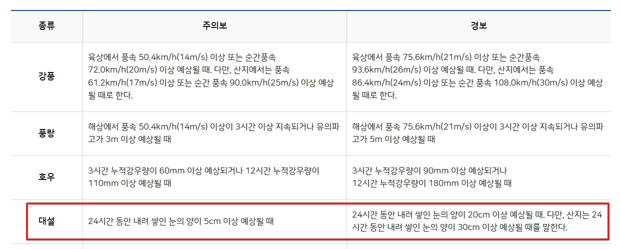 대설특보 대설주의보 대설경보 발령 기준
