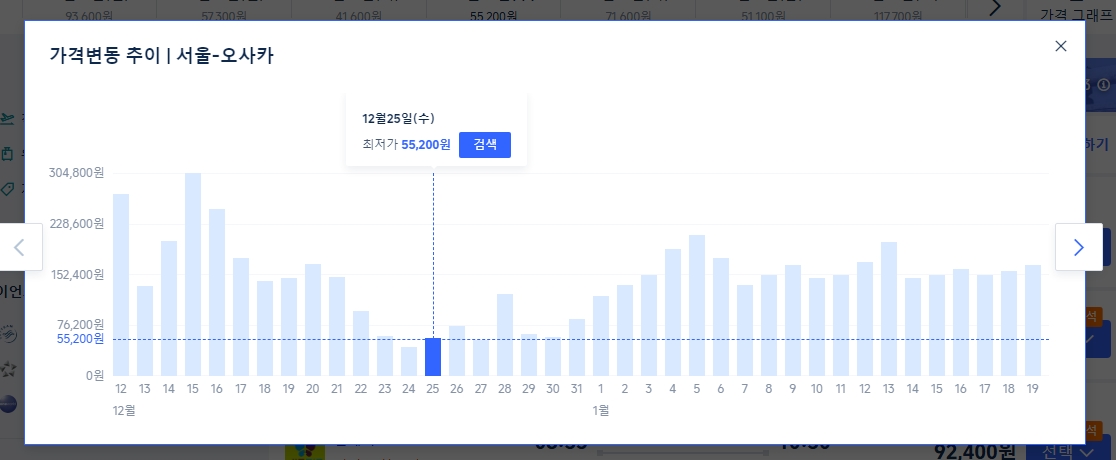 7. 가격 그래프 기능을 활용하면 며칠 차이로 항공권 가격이 얼마나 변하는지 한눈에 알 수 있어요. 예를 들면, 서울-오사카 구간을 볼 때 12월 25일이 제일 저렴하면 그 날짜로 여행을 맞출 수 있는 거죠. 최적의 날짜를 잡아서 훨씬 합리적인 예약이 가능합니다.