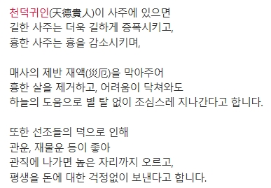 3. 내용을 읽어보면, 천덕귀인은 글자 그대로 하늘의 덕을 입은 귀한 사람을 뜻합니다. 평생 좋은 기운을 받으며 살아갈 가능성이 높다고 해석되기 때문에, 많은 분들이 이 길성을 반가워합니다.