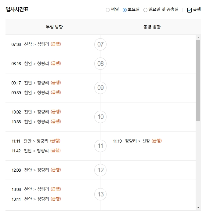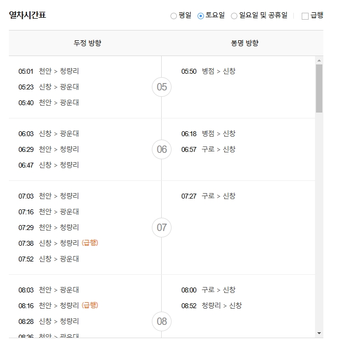 5. 주말에는 운행 횟수가 조금 줄지만 급행 열차는 그대로 다녀요. 토요일 오전에도 서울 방면으로 가는 급행이 꾸준히 운행되니, 빠르게 이동하고 싶을 때 활용하면 좋아요. 돌아오는 열차도 간격이 잘 맞춰져 있어서 이용에 불편함 없습니다.