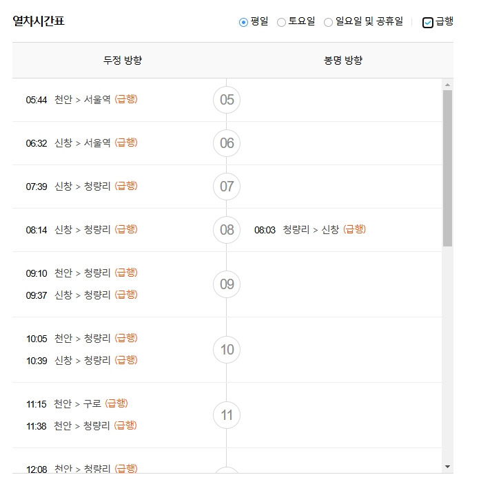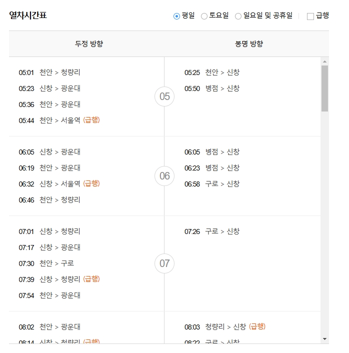 3. 평일 아침에는 청량리나 광운대 방향으로 가는 열차가 이른 시간부터 자주 다녀요. 첫차는 05:01에 천안에서 출발하고, 급행도 있어서 시간을 아끼고 빠르게 이동할 수 있습니다. 시간대별로 확인하면 이동 계획 세우는 데 훨씬 수월해요.