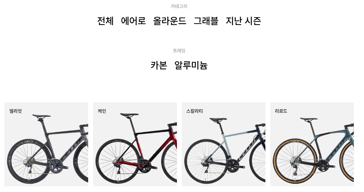3. 로드바이크는 가볍고 빠르게 달리는 데 초점을 맞춘 제품들이에요. 엘리엇, 케인, 스칼라티, 리로드 같은 모델이 대표적인데요, 공기 저항을 줄이기 위한 디자인과 경량화된 프레임이 특징이에요. 그래블 바이크도 있어서 일반 도로뿐 아니라 비포장길 주행도 고려한 분들에게도 좋아요.