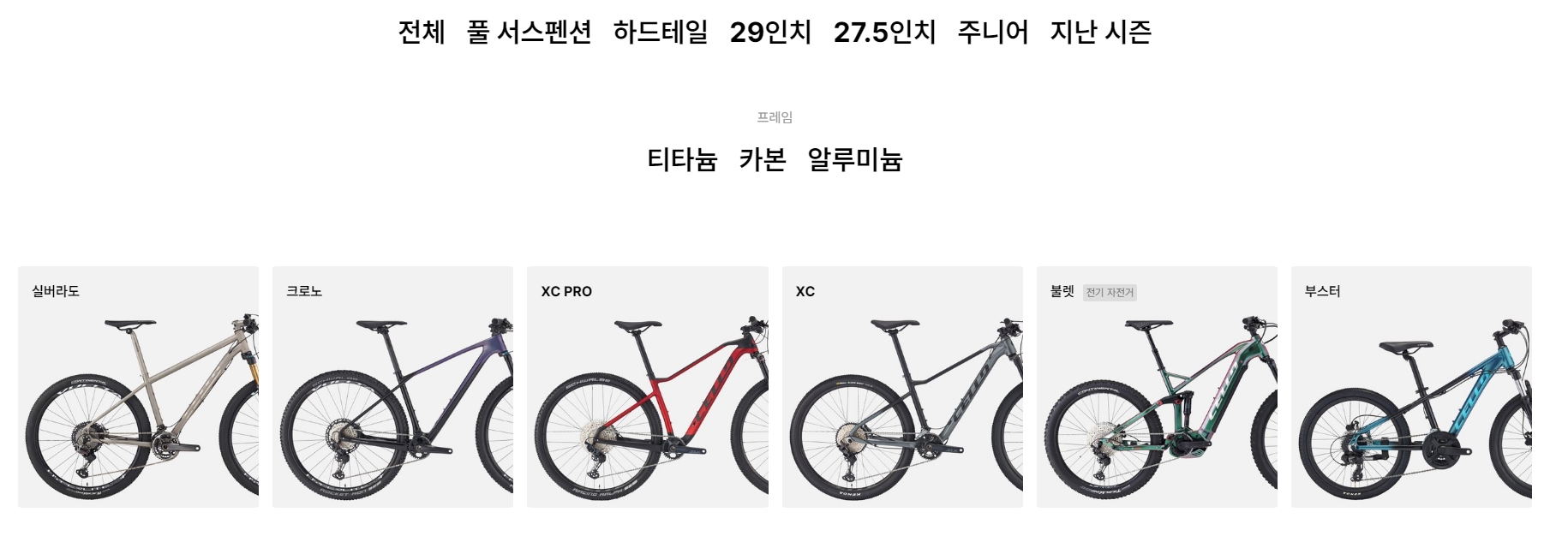 2. 산악 자전거(MTB) 카테고리에서는 하드테일과 풀 서스펜션 모델이 모두 있어요. 대표적으로 실버라도, 크로노, XC PRO, 불렛 같은 모델들이 있고요. 각 모델마다 주행 환경에 맞게 다르게 설계돼 있어서 초보자부터 상급자까지 선택의 폭이 넓어요. 프레임 소재도 다양해서 비교하면서 고르기 좋아요.
