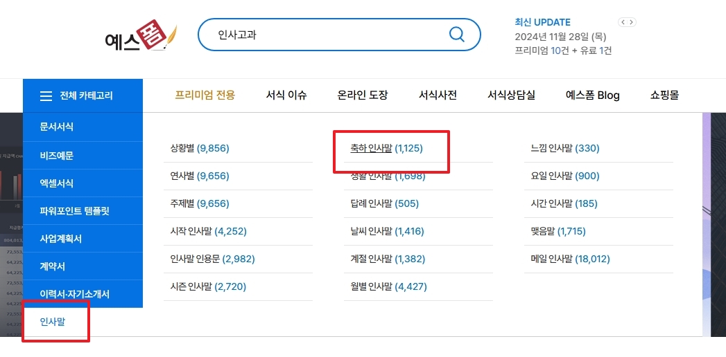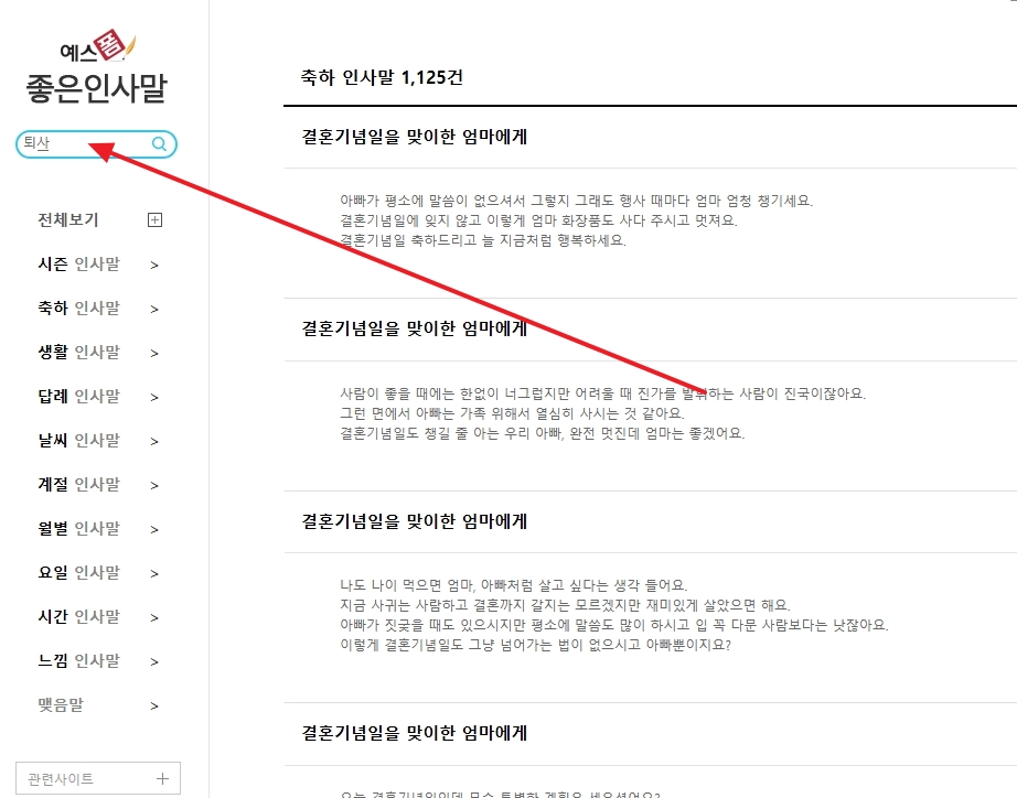 3. 인사말 카테고리 안에서 상단에 있는 검색창을 활용해 보세요. 여기에 ‘퇴사’라고 입력하면, 퇴사에 알맞은 다양한 문구들을 쉽게 찾아볼 수 있습니다.