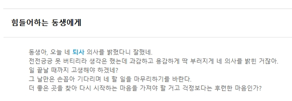 7. 힘들어했던 동생에게 전하고 싶은 말도 따뜻하게 정리해봤습니다. 퇴사를 결심했다는 건 그만큼 많은 고민을 했다는 증거니까요. 네 선택을 믿고, 언제나 응원할게. 지금은 잠시 쉬어가도 괜찮아. 더 좋은 기회는 분명히 올 거야. 앞으로의 하루하루가 지금보다 훨씬 더 나아지길 바란다.