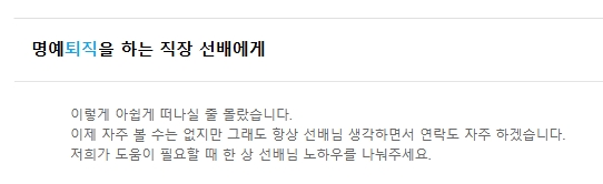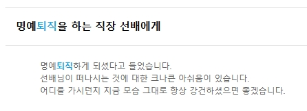 5. 또 다른 버전으로 작성해본 명예퇴직 인사말입니다. 갑작스러운 소식에 놀라기도 했지만, 늘 현명하고 따뜻했던 선배님의 모습이 오래도록 기억에 남을 것 같아요. 언제든 도움이 필요한 일이 있다면 꼭 연락주세요. 앞으로의 모든 날이 평안하고 행복하셨으면 좋겠습니다.