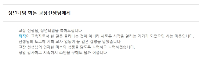 6. 정년퇴임을 맞이하신 교장 선생님께 드리는 말씀입니다. 오랜 세월 동안 학생들과 학교를 위해 헌신해 주신 덕분에 많은 이들이 좋은 영향을 받을 수 있었습니다. 이제는 그동안의 노고를 내려놓고 편안하게 새로운 인생을 즐기시길 진심으로 응원합니다.