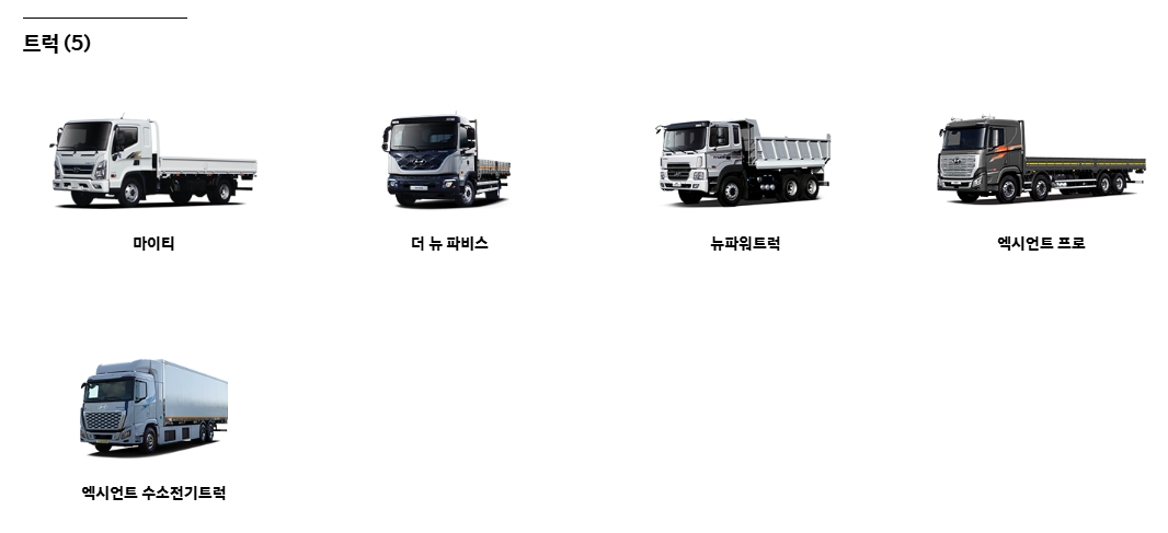 9. ‘트럭’ 항목에서는 대형 화물 운송에 맞춘 차량을 볼 수 있어요. 마이티, 파비스, 엑시언트 프로 등 다양한 상용 모델이 준비되어 있어서 물류나 운송업에 종사하시는 분들에게 유용합니다.