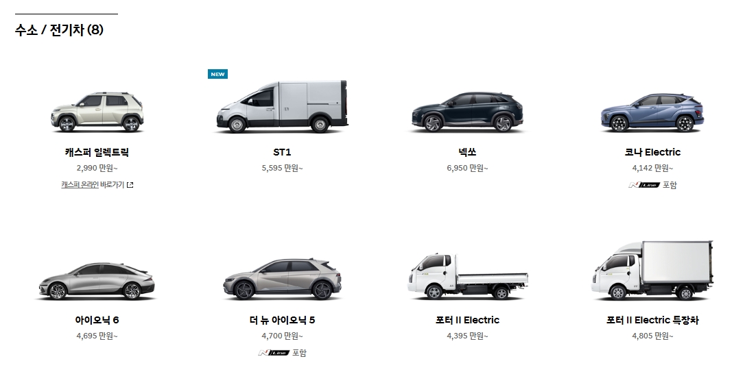 3. 친환경 차종을 보고 싶다면 수소/전기차 항목을 선택해보세요. 여기엔 캐스퍼 일렉트릭, 아이오닉 6, 더 뉴 아이오닉 5, 포터 II 일렉트릭 같은 전기차 모델이 들어있고, 각각의 용도나 주행 거리 등 세부 정보를 확인할 수 있습니다.
