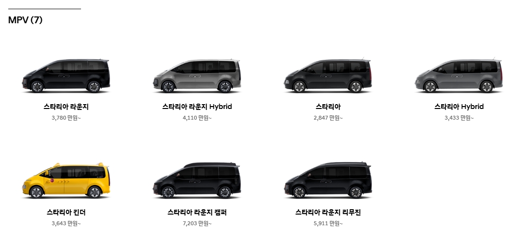 7. ‘MPV’는 여러 명이 타거나 짐을 자주 싣는 분들에게 적합해요. 스타리아 라운지, 스타리아 캠퍼 등 넓은 공간과 실용성을 강조한 차량들이 여기에 포함되어 있어요. 가족 여행이나 업무용 차량으로도 딱이에요.