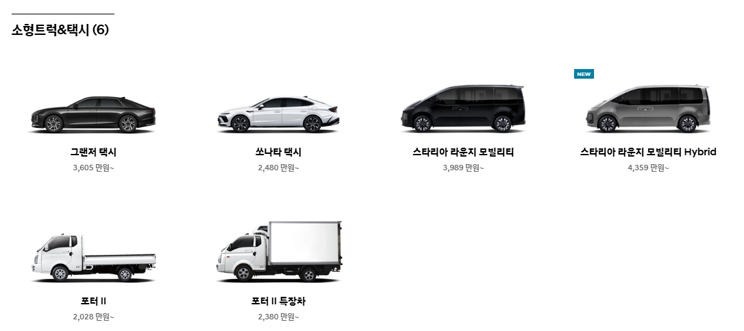 8. 실용성이 중요한 분들은 ‘소형트럭 & 택시’ 항목을 확인해보세요. 포터 II와 스타리아 라운지 모빌리티 같은 모델이 있어 일상적인 물류 운송이나 이동 목적에 알맞은 차량을 찾을 수 있습니다.