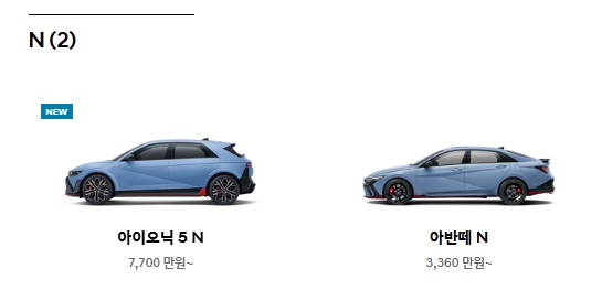 4. 성능 중심의 차량을 찾는다면 ‘N’ 카테고리를 확인하세요. 아이오닉 5 N과 아반떼 N처럼 엔진 성능이 뛰어나고 스포티한 감성을 살린 차량들이 여기에 포함됩니다. 평소 운전의 재미를 중요하게 생각하는 분들에게 추천해요.