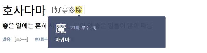3. 각각의 한자가 가진 의미를 살펴보면, ‘좋을 호(好)’, ‘일 사(事)’, ‘많을 다(多)’, ‘마귀 마(魔)’로 되어 있어, 말 그대로 좋은 일에 마(魔)가 많다는 식으로 풀이됩니다.