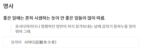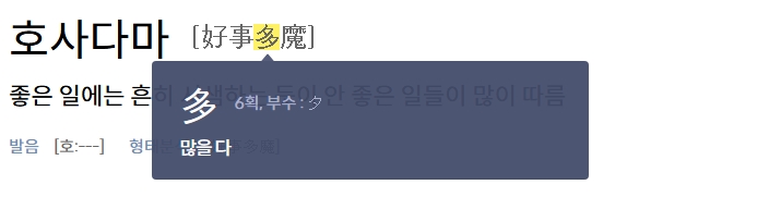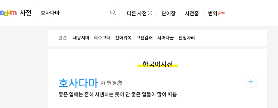 2. 검색창에 호사다마를 입력하면, 한자 표기와 함께 의미가 나옵니다. 이 표현은 좋은 상황이 생길 때 예상 못한 문제도 함께 올 수 있다는 경고의 의미로 쓰입니다.