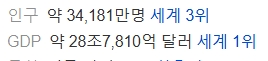 3. 인구는 약 3억 4천만 명으로 전 세계에서 세 번째로 많고, 민족 구성도 굉장히 다양합니다. 경제 규모는 세계 최고 수준으로, 28조 달러 이상 되는 GDP를 가지고 있어 글로벌 시장에서 영향력이 막강합니다. 그래서인지 전 세계에서 사람들이 끊임없이 모이는 곳이기도 하죠.