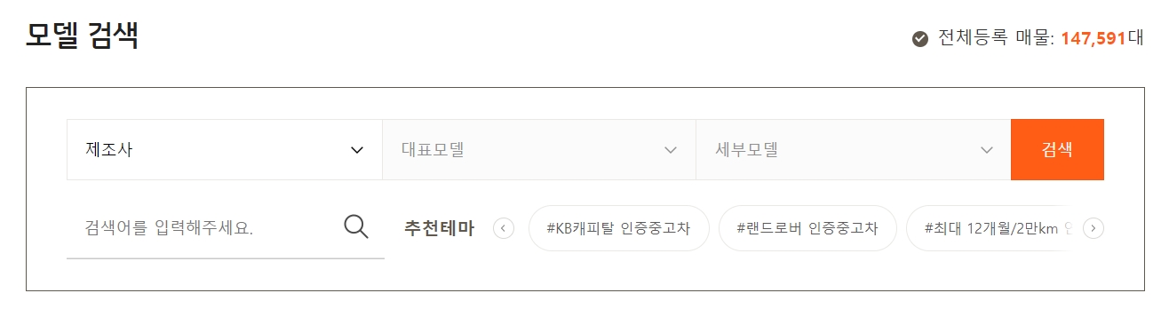 2. 원하는 차량을 쉽게 검색할 수 있는 맞춤형 검색 기능이 제공됩니다. 제조사, 모델명, 연식, 주행거리를 입력하면 사용자 맞춤형 검색 결과가 표시됩니다. 특히 인기 차량 리스트나 추천 테마를 활용하면 더 많은 옵션을 확인할 수 있어 편리합니다.