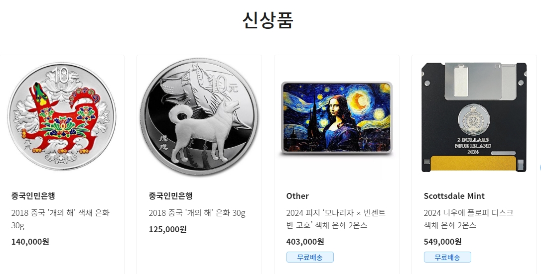 30g의 2018 중국 개의 해 색채 은화는 140,000원, 같은 무게의 일반 은화는 125,000원입니다. 또한 2024 피지 ‘모나리자 × 빈센트 반 고흐’ 은화는 403,000원에 판매되며, 예술적 테마를 좋아하는 분들에게 큰 인기를 끌고 있습니다.