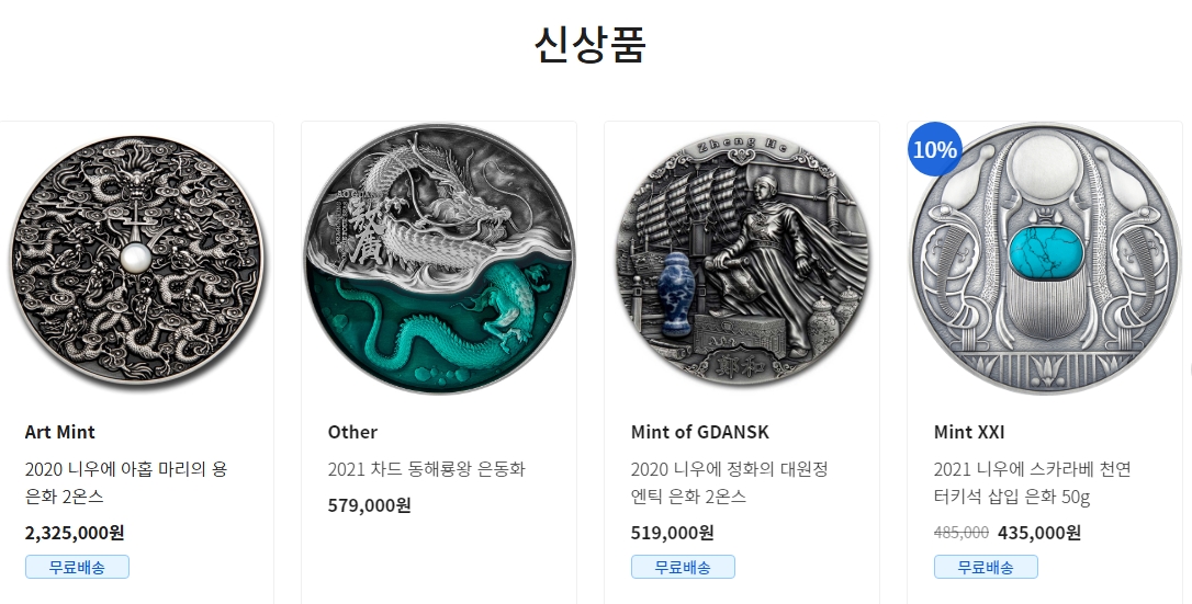 2020 니우에 아홉 마리의 용 은화는 2,325,000원, 2021 차드 동해룡왕 은동화는 579,000원, 정화의 대원정 은화는 519,000원 등 실물 제품도 구매가 가능합니다. 투자와 수집 목적 모두를 만족시키는 상품들입니다.