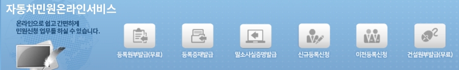 상단 메뉴에서 민원신청을 클릭하면 다양한 민원 서비스를 확인할 수 있습니다. 이 메뉴에서는 등록원부 발급, 말소사실증명 발급, 신규 등록 신청 등 자동차와 관련된 모든 민원 서비스를 신청할 수 있는 옵션이 표시됩니다. 원하는 서비스를 선택하여 필요한 정보를 입력하면 간단히 신청이 가능합니다.