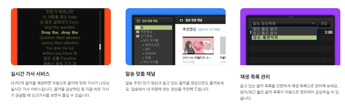알송은 여전히 오프라인 MP3 재생에 최적화된 프로그램입니다. 간단한 설치 후, 자동 가사 싱크 기능과 직관적인 인터페이스 덕분에 지금도 추억의 음악 감상을 즐기기에 안성맞춤입니다.