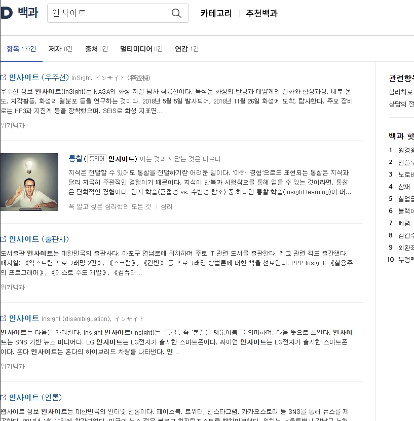 가장 정확한 의미를 파악하려면 공신력 있는 사전을 참고하는 것이 좋습니다. 다음백과에서는 ‘인사이트’의 사전적 정의는 물론, 연관 개념과 다양한 분야에서의 활용 예까지 풍부한 자료로 제공하고 있습니다.