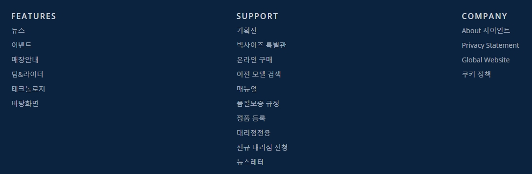 홈페이지 상단에는 자전거·용품·대리점 검색 메뉴가 있어요. 로드, MTB, 그래블 등 카테고리별 제품을 쉽게 찾을 수 있고, 각 제품의 스펙과 특징도 자세히 볼 수 있습니다.