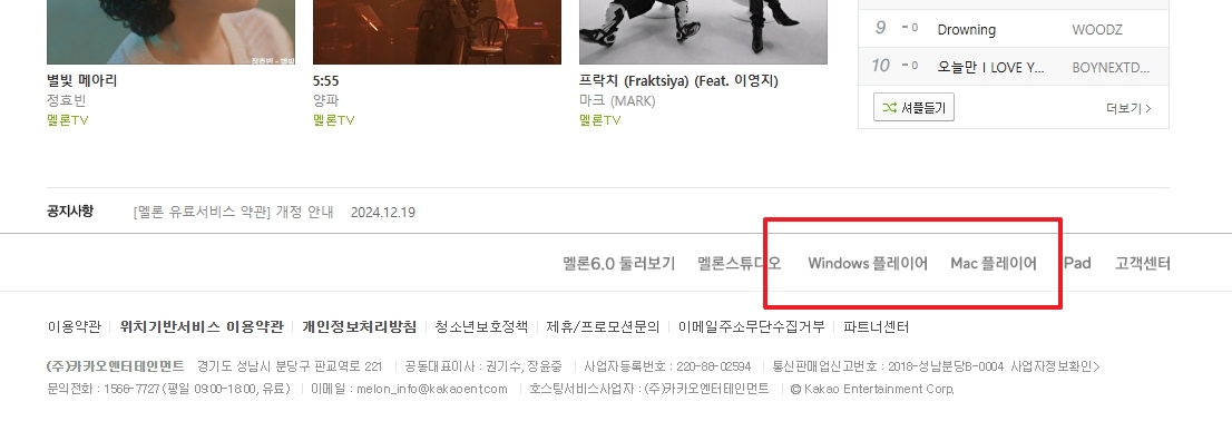 멜론 플레이어는 공식 홈페이지에서만 안전하게 다운로드할 수 있습니다. 홈페이지 접속 후 화면을 가장 아래까지 스크롤하면 다운로드 관련 메뉴가 나타납니다.