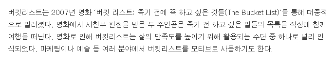 버킷리스트는 '죽기 전에 꼭 하고 싶은 일'을 정리한 목록이에요. 사진 속 내용처럼 중세 유럽의 '양동이 차기'라는 표현에서 유래됐다고 하고, 지금은 자신만의 인생 목표를 구체화하는 도구로 널리 사용되고 있어요.