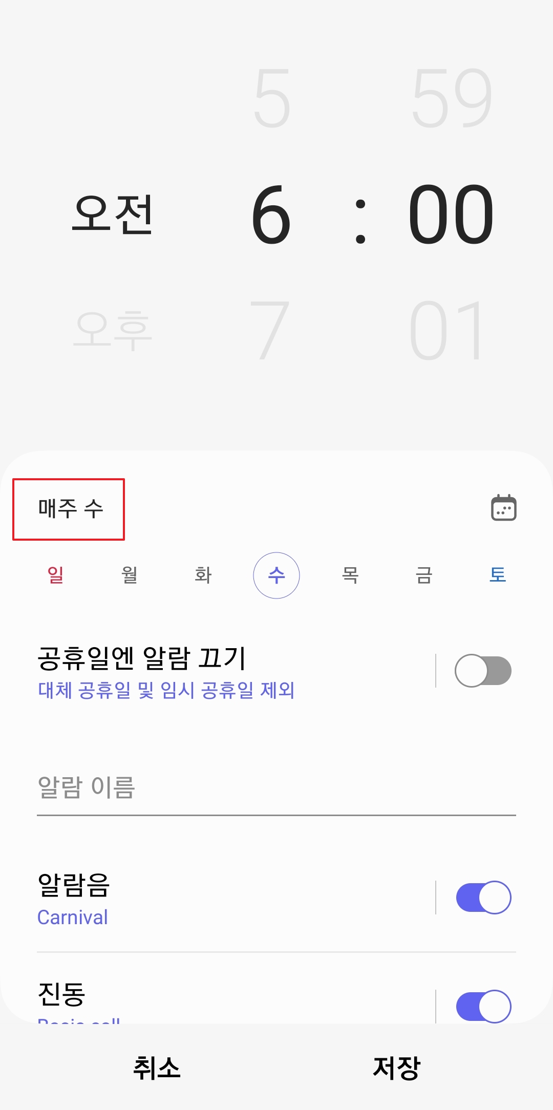 알람을 특정 요일마다 반복되도록 설정할 수 있으며, 공휴일에는 자동으로 꺼지도록 설정할 수도 있습니다. 단, 대체 공휴일이나 임시 공휴일은 자동 인식이 안 될 수 있으니 일정 확인은 필요합니다.