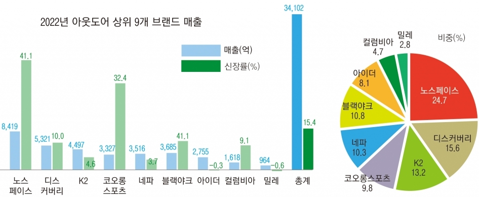 6. 2023년과 2022년 데이터를 바탕으로 아웃도어 브랜드들의 성과를 분석하면, 노스페이스의 독보적인 위치가 더욱 명확해집니다. 시장 점유율에서도 약 30%를 차지하며 타 브랜드들과 큰 차이를 보이고 있는 점이 인상적이에요. 반면, 디스커버리와 K2는 자체적인 경쟁력을 유지하며 각각의 위치를 지키고 있지만, 노스페이스의 강세를 따라잡기는 쉽지 않아 보입니다.