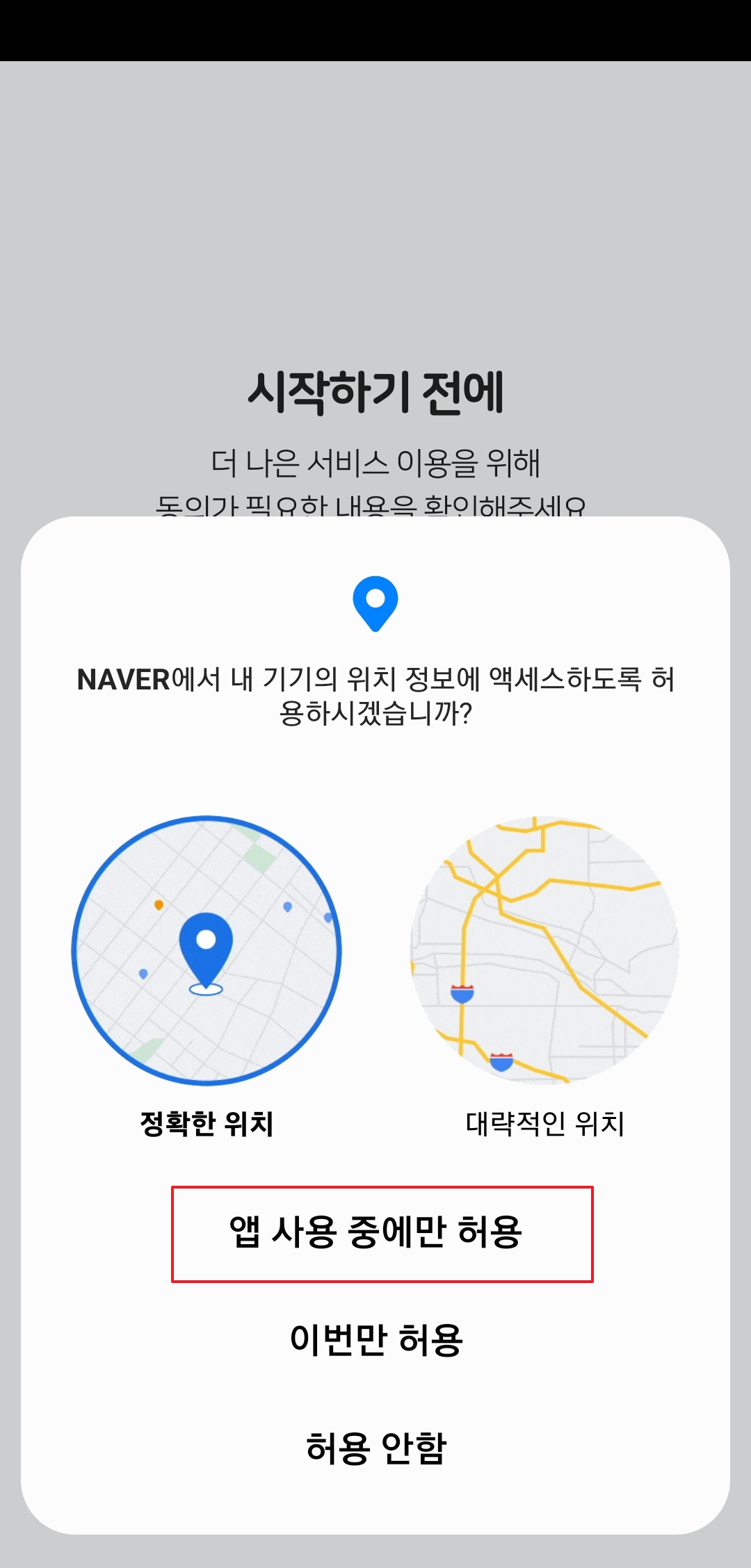 앱 사용 중에만 허용을 선택하면 네이버가 현재 위치 기반으로 주변 맛집이나 상점 정보를 제공해 줍니다. 단, 개인정보 보호가 중요하다면 ‘허용 안 함’도 가능합니다.