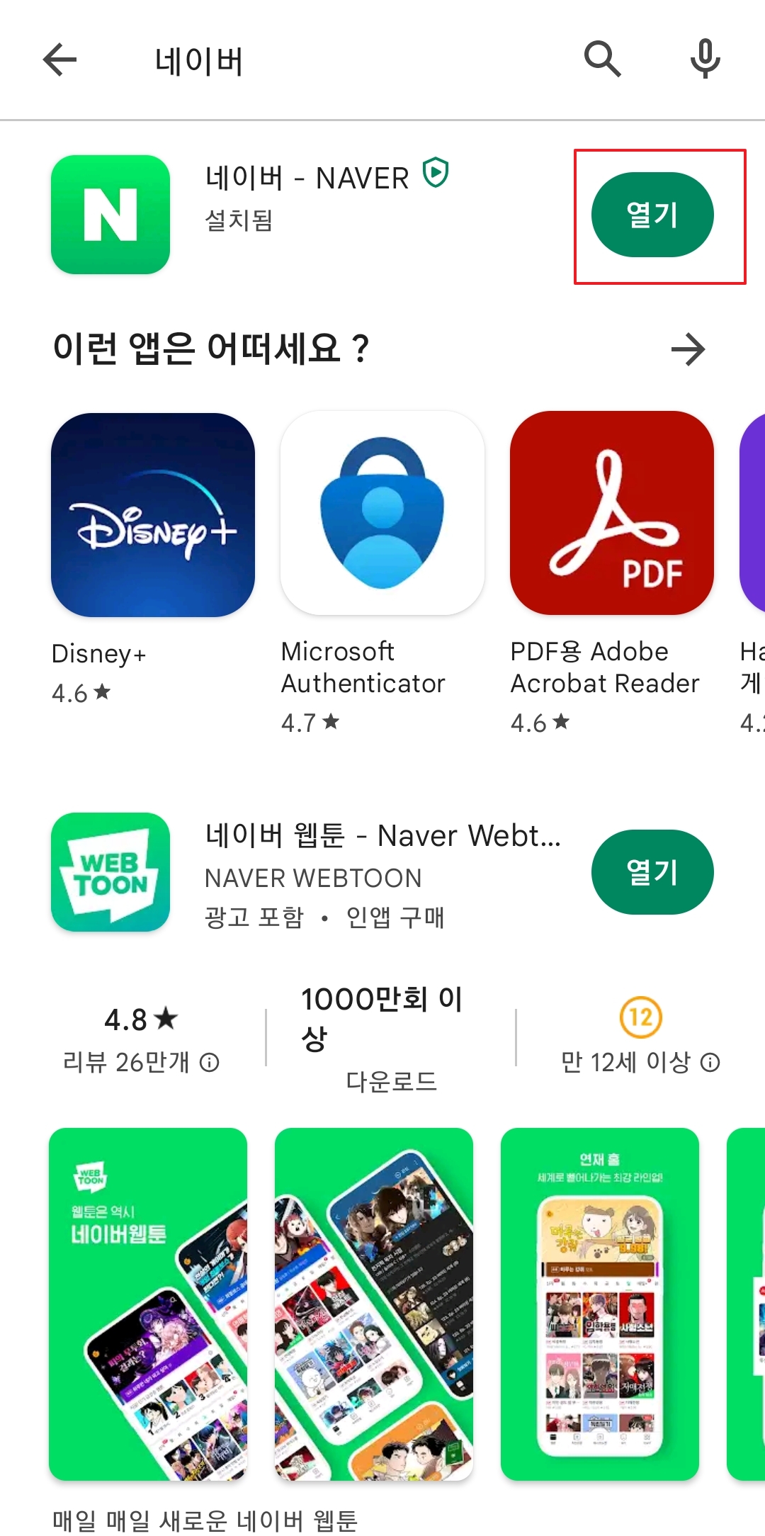 설치가 완료되면 버튼이 ‘설치’ → ‘열기’로 변경됩니다. 이 버튼을 누르면 네이버 앱이 처음 실행되며, 이후 **초기 설정 과정**으로 넘어갑니다.