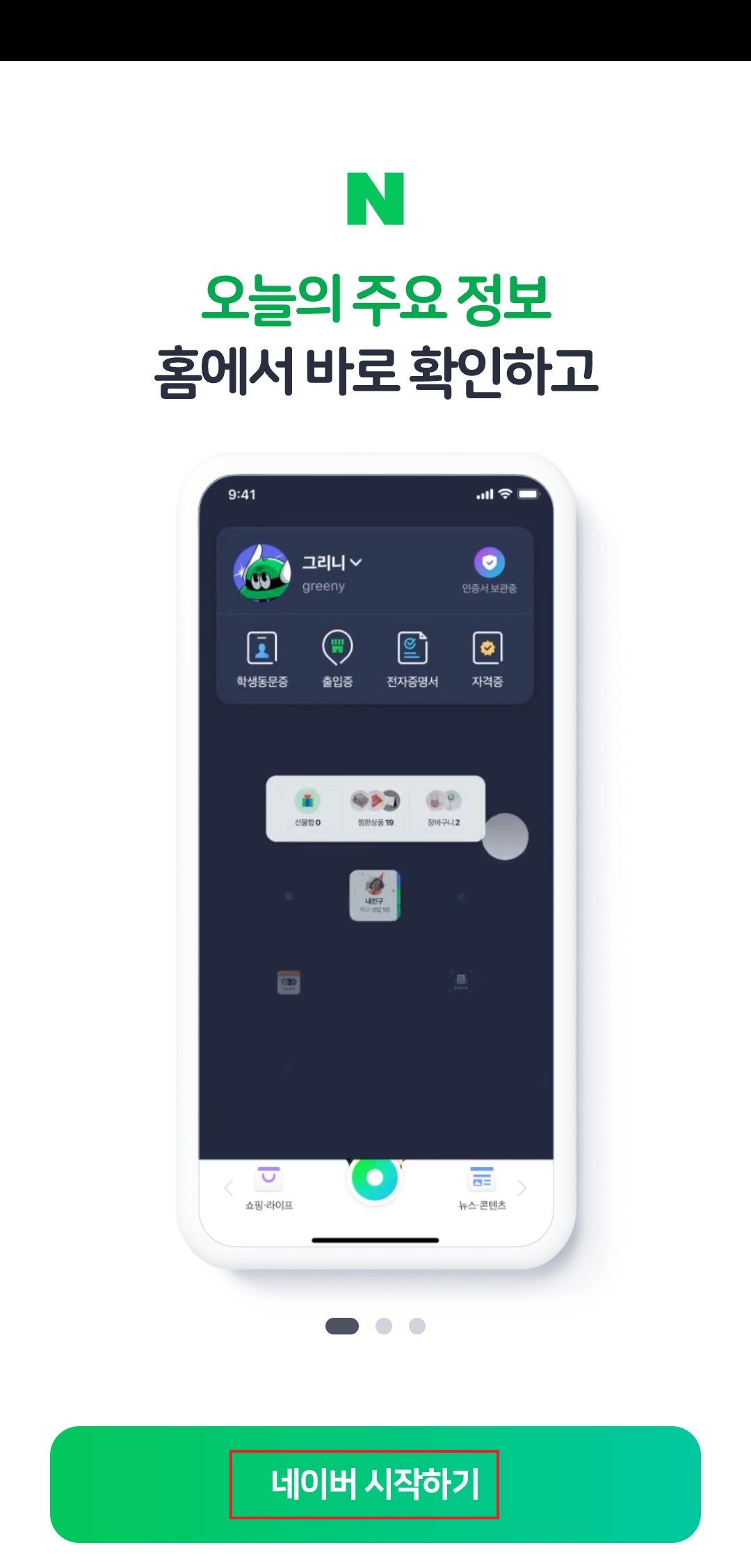 모든 설정이 끝나면 드디어 네이버 앱의 메인 화면이 나타납니다. 초보자들을 위한 ‘사용 팁’도 나오니까 한 번쯤 읽어보는 것도 좋습니다. 이제 네이버의 모든 기능을 **앱 하나로 간편하게 활용**하실 수 있습니다.