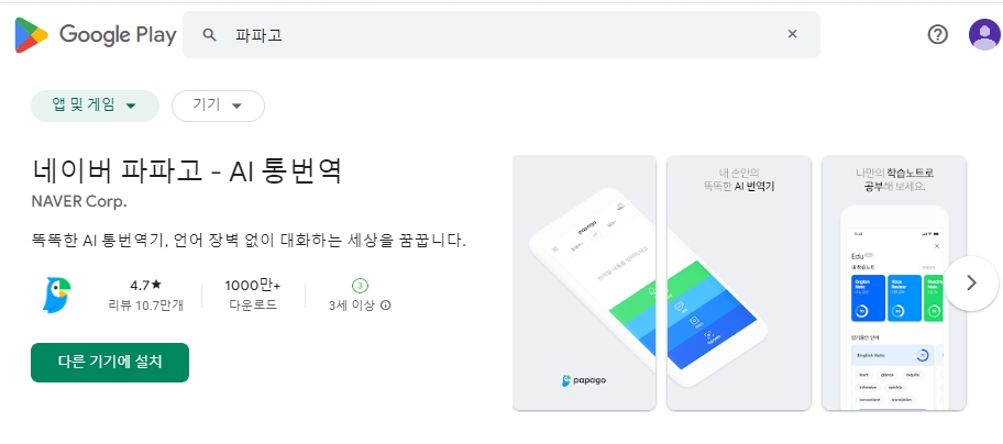 ‘파파고’를 검색하면 네이버에서 제공하는 번역 어플이 나타납니다. 설치 버튼을 누르면 자동으로 다운로드 및 설치가 진행되며, 별도의 설정 없이도 바로 사용 가능합니다.