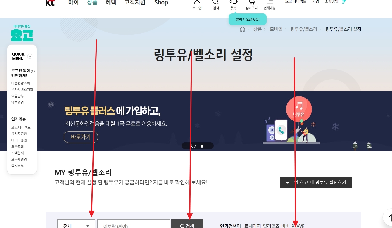 검색 결과 중에서 ‘링투유/벨소리’ 메뉴를 클릭하면 상세 서비스 설명 페이지로 이동하게 됩니다. 이곳에서 다양한 상품 소개 및 가입 정보 등을 확인할 수 있어요.
