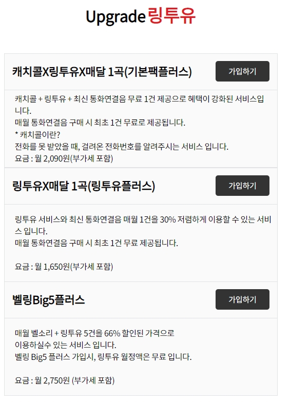 ‘캐치콜X링투유X매달 1곡’, ‘벨링Big5플러스’ 등 합리적인 요금으로 여러 혜택을 받을 수 있는 패키지도 있어요. 예를 들어, 벨링Big5플러스는 벨소리+링투유 5건을 66% 할인된 가격에 제공하고, 매달 자동으로 곡을 교체해줘서 관리도 편합니다.