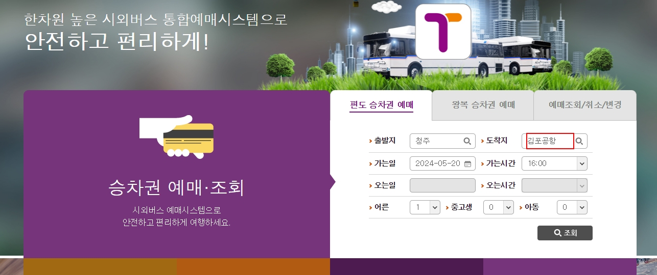 홈페이지 좌측에 있는 운송정보조회 메뉴에서 출발지를 청주터미널로 기본 설정할 수 있으며, 필요 시 청주대정류소, 남청주정류소, 사창정차장, 청주공항정차장으로 변경할 수 있습니다.