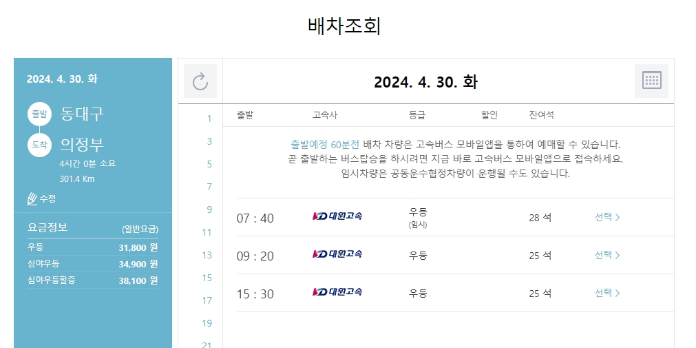 4. 동대구-의정부 노선을 조회하면 하루에 3대의 버스가 운행 중임을 확인할 수 있습니다. 저도 평상시 이 정보를 참고해 일정 조율을 했는데, 예매 전 정확한 출발 시각을 반드시 확인해야 합니다.