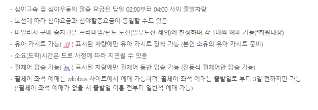5. 심야 할증 요금은 새벽 2시부터 4시 사이 출발하는 우등 및 고속 버스에 적용되며, 노선별로 기본 요금과 동일할 수도 있습니다. 다만 마일리지로 구매할 수 있는 승차권은 프리미엄 또는 편도 노선에 한해 회원당 1매만 예매할 수 있습니다. 유아 카시트는 표시된 차량에만 장착 가능하니, 본인 소유의 카시트를 꼭 준비해야 합니다. 휠체어 탑승은 전동식만 허용되며, 휠체어 좌석 예매는 출발 3일 전까지 가능하고, 잔여 좌석이 없을 시 출발 이틀 전부터 일반석을 예매할 수 있습니다.