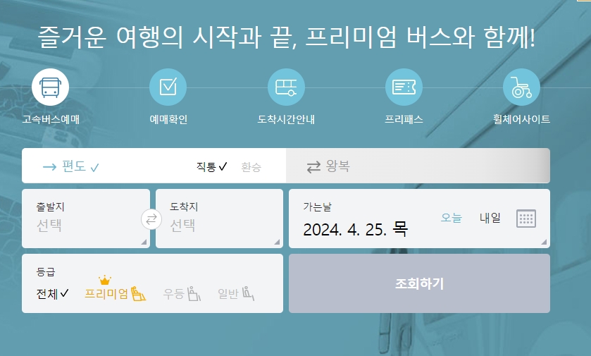 3. 출발지와 도착지를 정한 뒤 달력 버튼을 눌러 원하는 날짜를 지정하고 '조회하기'를 클릭하면 해당 날짜의 시간표가 표시됩니다. 주말이나 공휴일은 조회 시 잔여 좌석이 빠르게 마감될 수 있으니, 미리 예매 창을 확인하는 것이 좋습니다.
