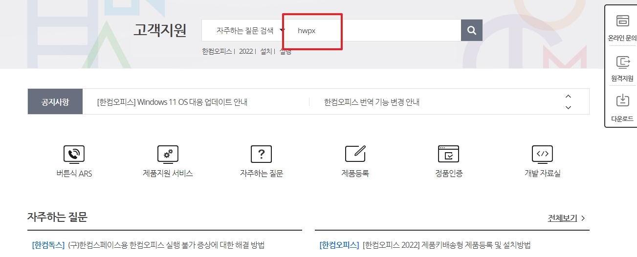 2. 고객지원 페이지 왼쪽 검색창에 'hwpx'를 입력하여 관련 자주 묻는 질문과 도움말을 확인합니다. 이때 검색어 철자가 부정확하면 원하는 정보를 찾기 어려우니 정확히 입력해야 합니다.