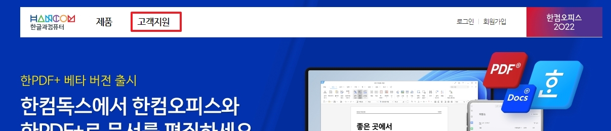 1. 한글과컴퓨터 공식 홈페이지에 접속하여 화면 상단의 고객지원 메뉴를 클릭합니다. 단, 홈페이지 개편으로 메뉴 위치가 변경될 수 있으므로 상단 메뉴바 전체를 꼼꼼히 확인하세요.