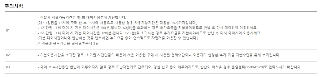 5. 화면 하단에 표시된 기간 계산 방식은 첫 대여 시점을 기준으로 유효 기간이 시작되며, 이용권 사용 기간이 지나면 자동으로 대여가 중단되니 반납 시간을 꼭 확인하세요. 단 4시간 이상 미반납 시 분실로 처리되므로 긴 이용이 필요할 경우 미리 운영 센터에 문의하셔야 합니다.