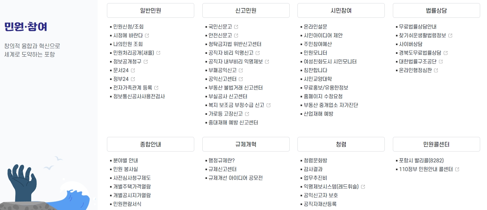 3. 포항시청 홈페이지에서는 시민들이 직접 민원을 신청하거나 처리 과정을 확인할 수 있는 민원 서비스가 매우 편리하게 제공되고 있어요. 더불어, 신고 민원과 시민 참여 코너도 마련되어 있어서 지역 문제에 관심 있는 사람들에게 적극적인 참여 기회를 제공합니다. 처리 과정이 투명하게 공개되어 신뢰도를 높이고 있는 점도 인상적이에요. 이러한 시스템을 활용해 보다 나은 포항을 만들어가는 데 동참해 보세요!