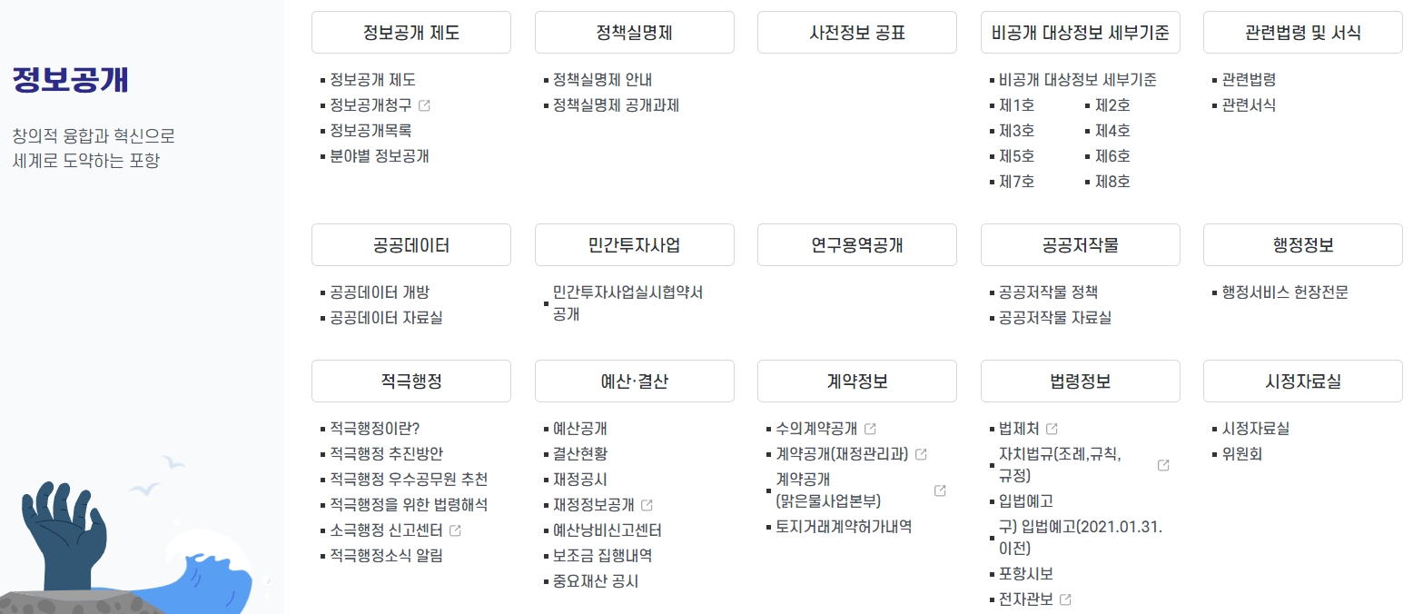 5. 포항시는 투명한 행정을 위해 정보 공개에도 많은 노력을 기울이고 있습니다. 예산 사용 내역부터 주요 정책 정보, 공공 데이터까지 시민들이 쉽게 접근할 수 있도록 자료를 공개하고 있어요. 이를 통해 행정의 신뢰를 높이고, 시민들이 시정에 적극적으로 참여할 수 있는 기회를 제공합니다. 홈페이지에서 제공하는 다양한 자료를 확인하며, 포항의 발전에 대해 더 깊이 이해할 수 있습니다.