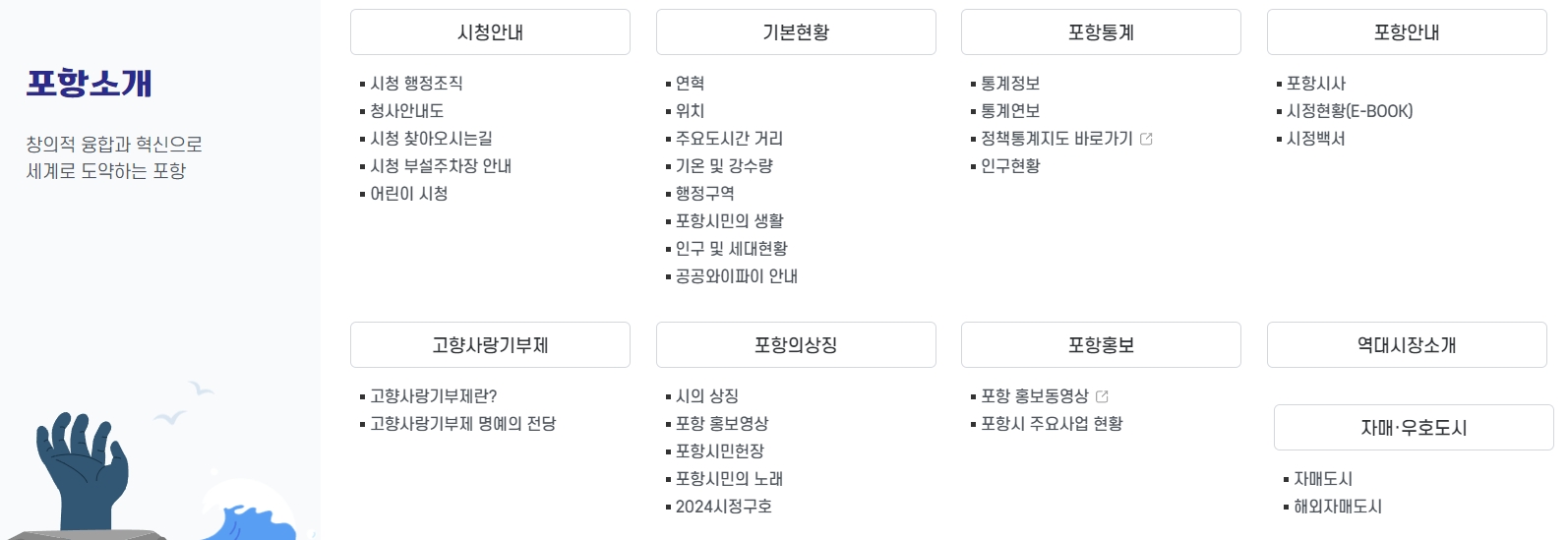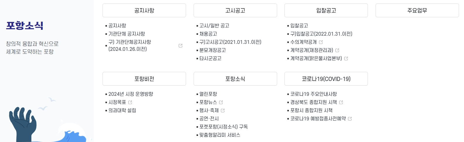 2. 홈페이지 첫 화면에서는 포항의 행정 비전과 주요 정책이 한눈에 들어옵니다. 포항시는 지속 가능한 발전과 창의적인 도시 구축을 목표로 하며, 다양한 프로그램을 통해 주민과 함께하는 행정을 실현하고 있습니다. 또한, 홈페이지를 통해 포항시청을 쉽게 방문할 수 있도록 교통 안내와 위치 정보도 제공되니 초행길에도 걱정이 없겠죠? 홈페이지 곳곳에서 포항의 매력을 느낄 수 있는 콘텐츠를 발견할 수 있어요.