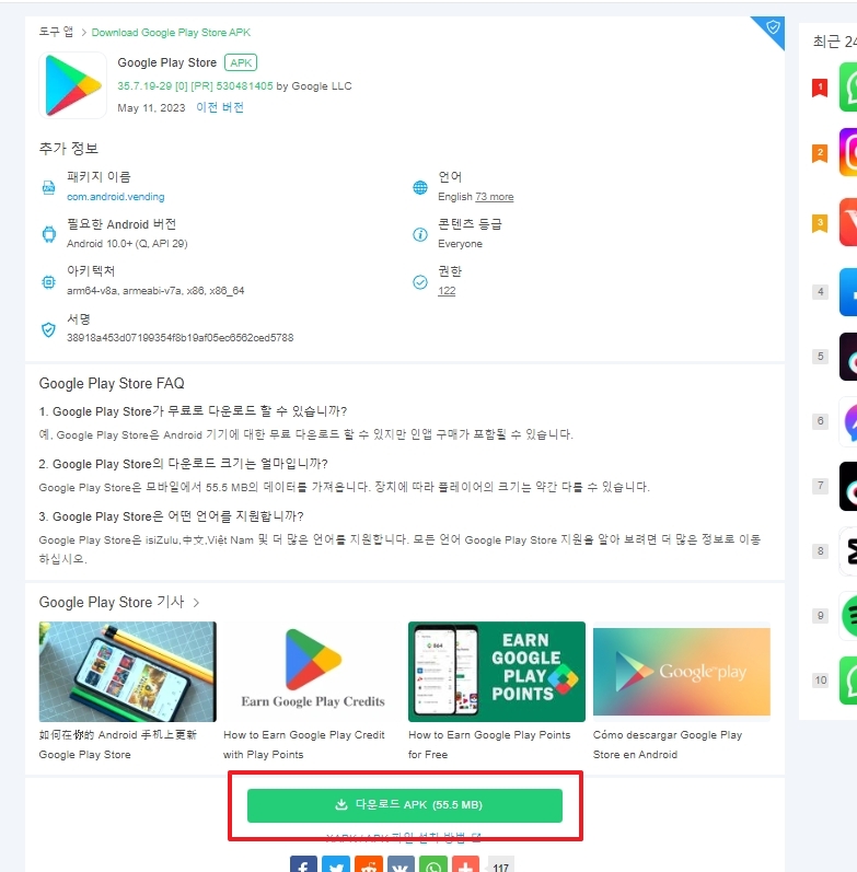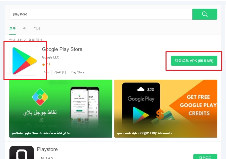 3. 검색 결과에서 구글 플레이스토어를 선택하고 다운로드 버튼을 클릭합니다. 일부 사이트에서는 다운로드 버튼을 여러 번 클릭해야 하는 경우도 있습니다. 이 과정에서 잘못된 광고 링크를 클릭하지 않도록 주의하세요.