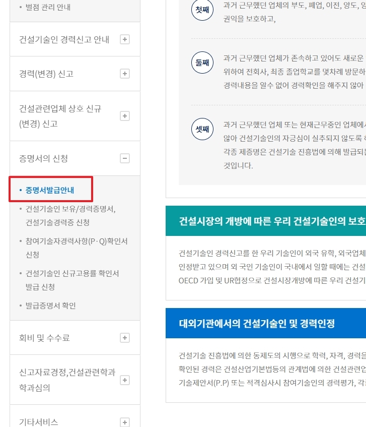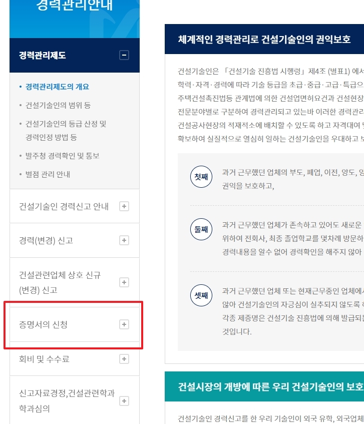 1. 회원이 인터넷 사이트에 접속한 후 상단 메뉴에서 경력관리안내를 선택하면 메인 화면이 표시되며, 좌측 사이드바에는 증명서 신청과 증명서 발급안내 메뉴가 나란히 배치되어 있어 사용자가 원하는 항목을 쉽게 찾을 수 있도록 구성되어 있습니다.